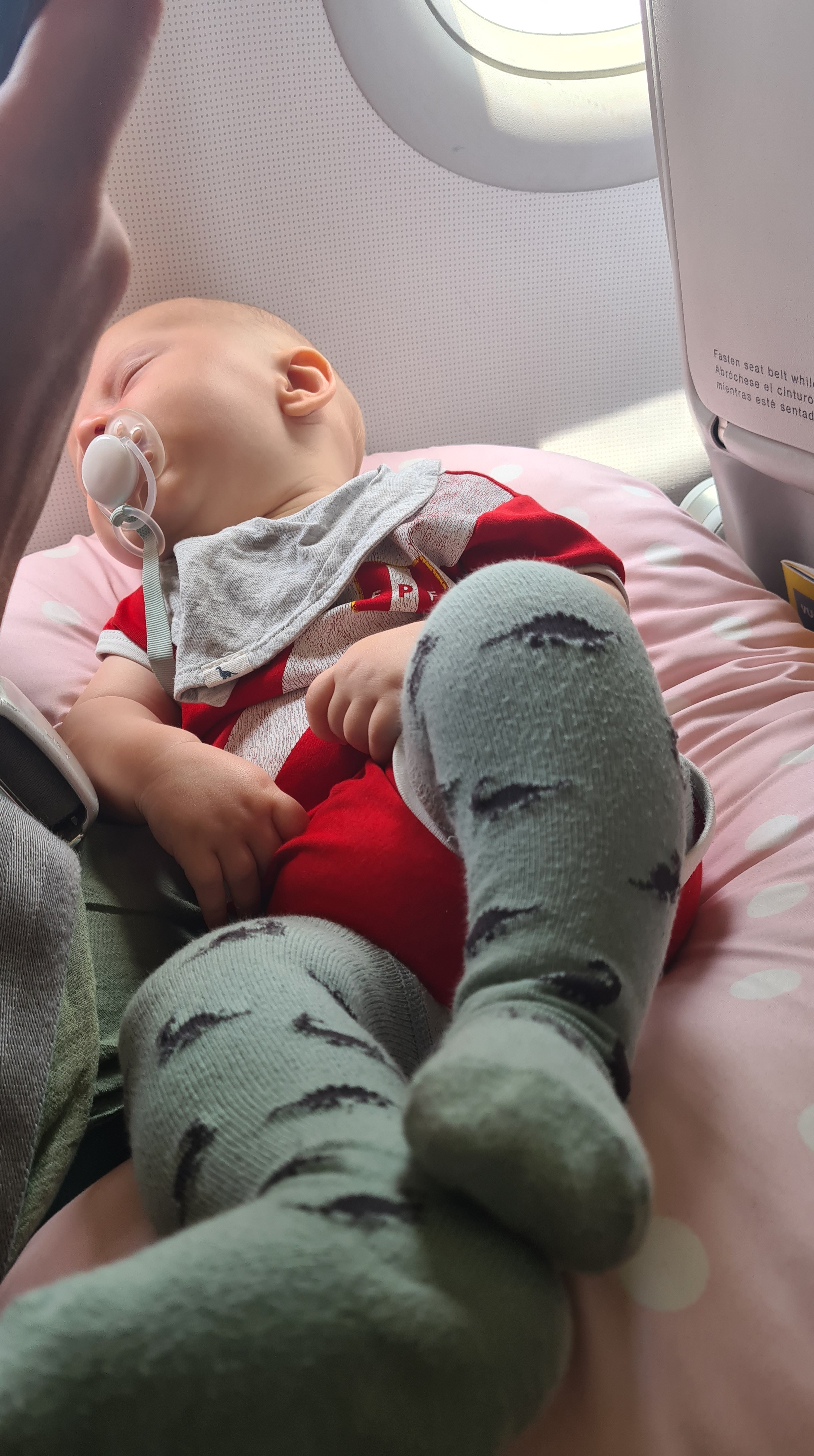 Today, we’re addressing the most frequently asked questions about flying with a baby (and keeping them safe!) Here’s a picture of our baby, sound asleep…